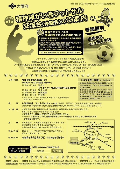 | 主催等 | 主催:大阪府 主管:社会福祉法人精神障害者社会復帰促進協会 企画運営:フットサル交流事業実行委員会 協力(予定含む):一般社団法人大阪府サッカー協会、シュライカー大阪、 大阪成蹊大学フットサル部、株式会社ミカサ、株式会社モルテン |