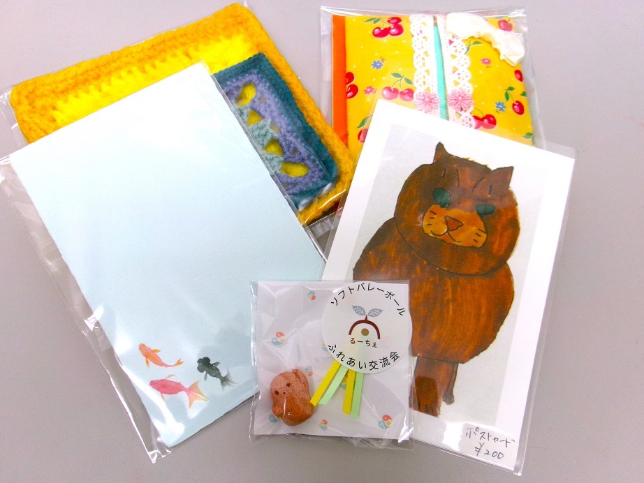 参加賞は参加事業所の皆さんの自主製品。ポストカード、紙すき葉書、高槻市の埴輪の置物など、個性豊かな製品を皆さんにお持ち帰り頂きました。