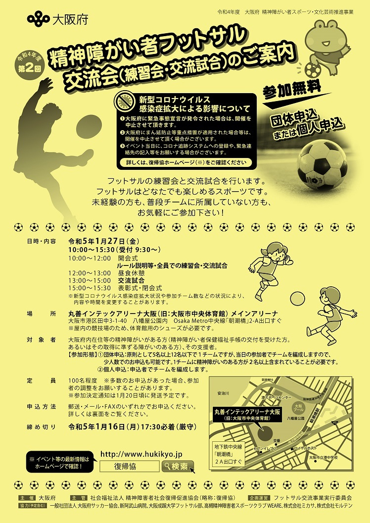 | 主催等 | 主催:大阪府 主管:社会福祉法人精神障害者社会復帰促進協会 企画運営:フットサル交流事業実行委員会 協力(予定含む):一般社団法人 大阪府サッカー協会、新阿武山病院、大阪成蹊大学 フットサル部、高槻精神障害者スポーツクラブ WEARE、株式会社ミカサ、株式会社モルテン |