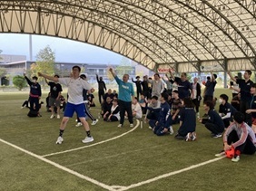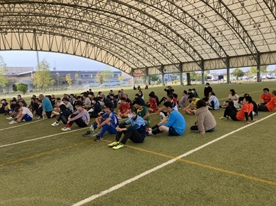 審判は大阪成蹊大学フットサル部の皆さんにして頂き、早朝の設営から最後の後片付けまでご協力下さいました。講習会・交流試合では参加者に楽しく声掛けやアドバイスをして下さり、少人数のチームのサポートに入って頂き、終了後は参加者全員でのストレッチもして下さいました。