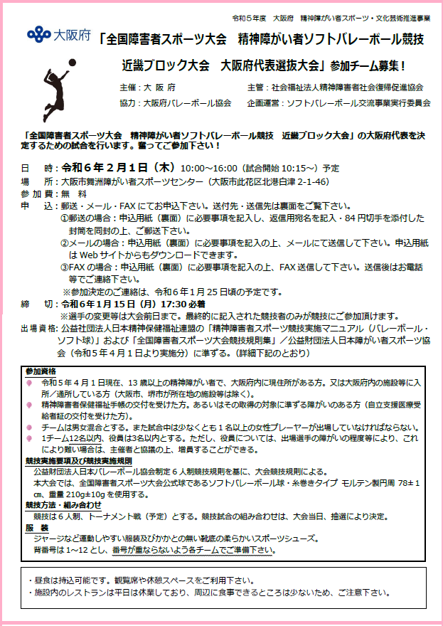 | 主催等 | 主催:大 阪 府 主管:社会福祉法人精神障害者社会復帰促進協会 企画運営:ソフトバレーボール交流事業実行委員会 協力:大阪府バレーボール協会 |