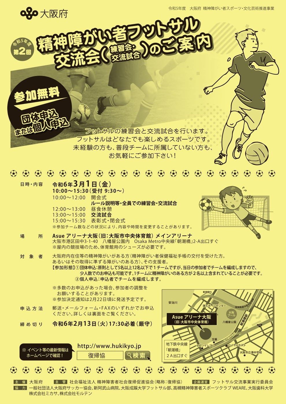 社会福祉法人精神障害者社会復帰促進協会(宛名は「復帰協」でも可)「フットサル」係 〒552-0001 大阪市港区波除5-7-6-201 開所時間:月~金の9:00~17:30(土日祝日は休所) E-mail:hukikyo@kss.biglobe.ne.jp TEL:06-6567-8071 FAX:06-6567-8089 |