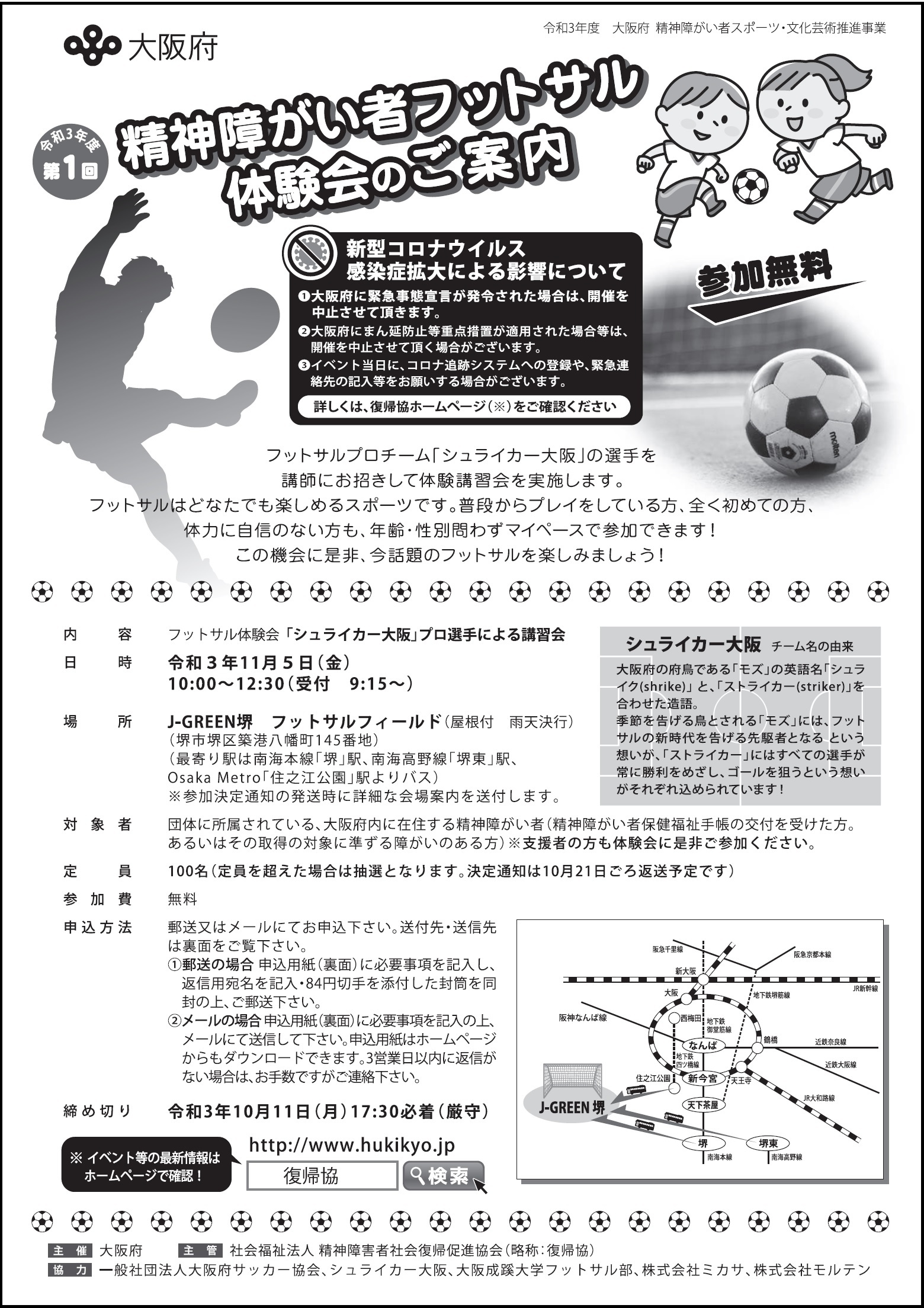 | 主催等 | 主催:大阪府 主管:社会福祉法人精神障害者社会復帰促進協会 協力:一般社団法人大阪府サッカー協会、シュライカー大阪、 大阪成蹊大学フットサル部、株式会社ミカサ、株式会社モルテン |