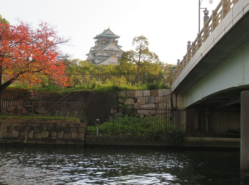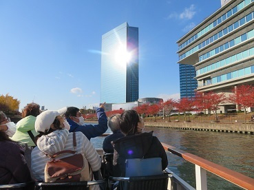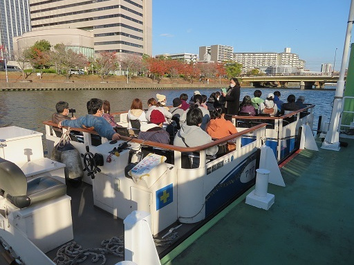 船は多くの橋をくぐって進んでいきます。大阪は橋が多いまちですが、町民が生活のために、自腹を切って橋をかけることが多かったのだそう。船頭さんの興味深い解説を聞きながら、大阪城、中之島、中央公会堂、造幣局、美しい紅葉を船上から遊覧。日が陰ると少し寒くなってきましたが、水都大阪を満喫することができました。