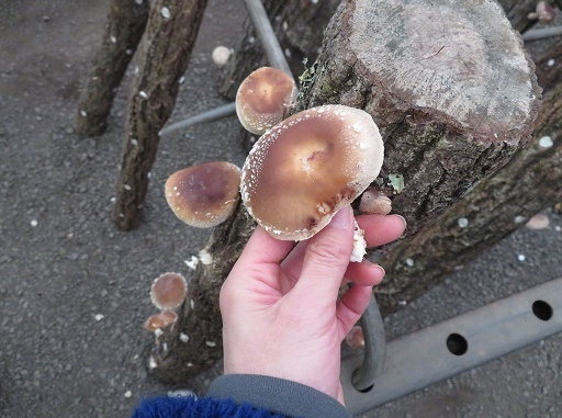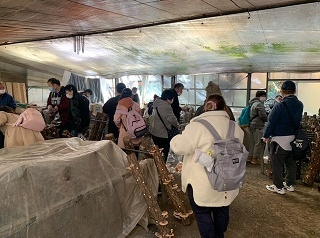 まず、しいたけセンターでしいたけ狩り。建物の中には原木がびっしりと並び、立派なしいたけが!皆さん大きなものを中心に収穫されていました。
