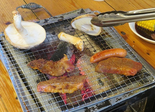 しいたけ狩りの後はお待ちかねのバーベキュー。バーベキュー施設の職員の方が、しいたけの美味しい焼き方を教えてくださいました。傘の内側を上にして焼くと、しいたけの水分がふつふつと出て来ます。これに醤油を垂らしたり塩をかけると、ジューシーで肉厚で最高!皆さんは「美味しい」「来て良かった」と満面の笑み。