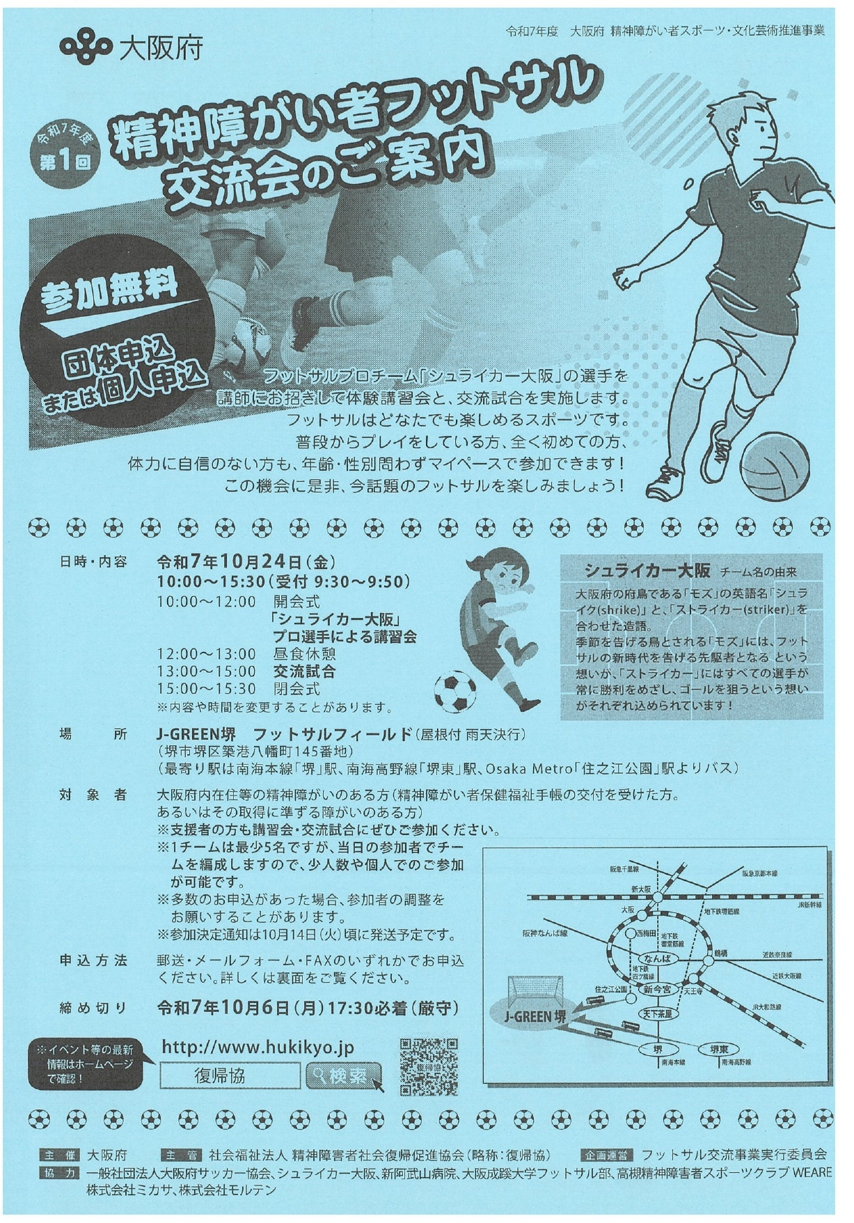 | お申込・お問い合わせ先 | 社会福祉法人 精神障害者社会復帰促進協会(宛名は「復帰協」でも可)「フットサル」係 開所時間:月~金の9:00~17:30(土日祝日は休所) E-mail:hukikyo@kss.biglobe.ne.jp TEL:06-6567-8071 FAX:06-6567-8089 |