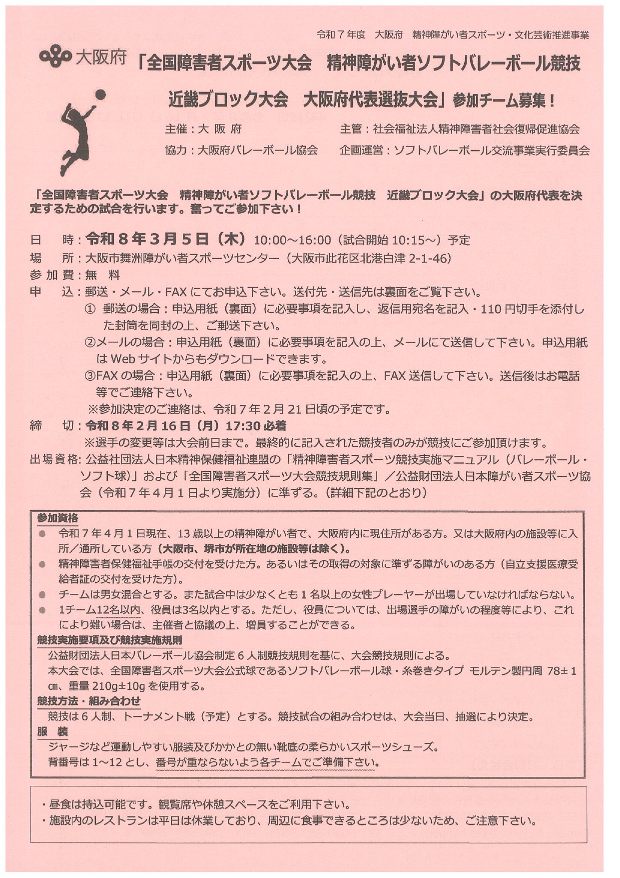 | 主催等 | 主催:大阪府 主管:社会福祉法人精神障害者社会復帰促進協会 企画運営:ソフトバレーボール交流事業実行委員会 協力(予定含む):大阪府バレーボール協会・株式会社ミカサ・株式会社モルテン |