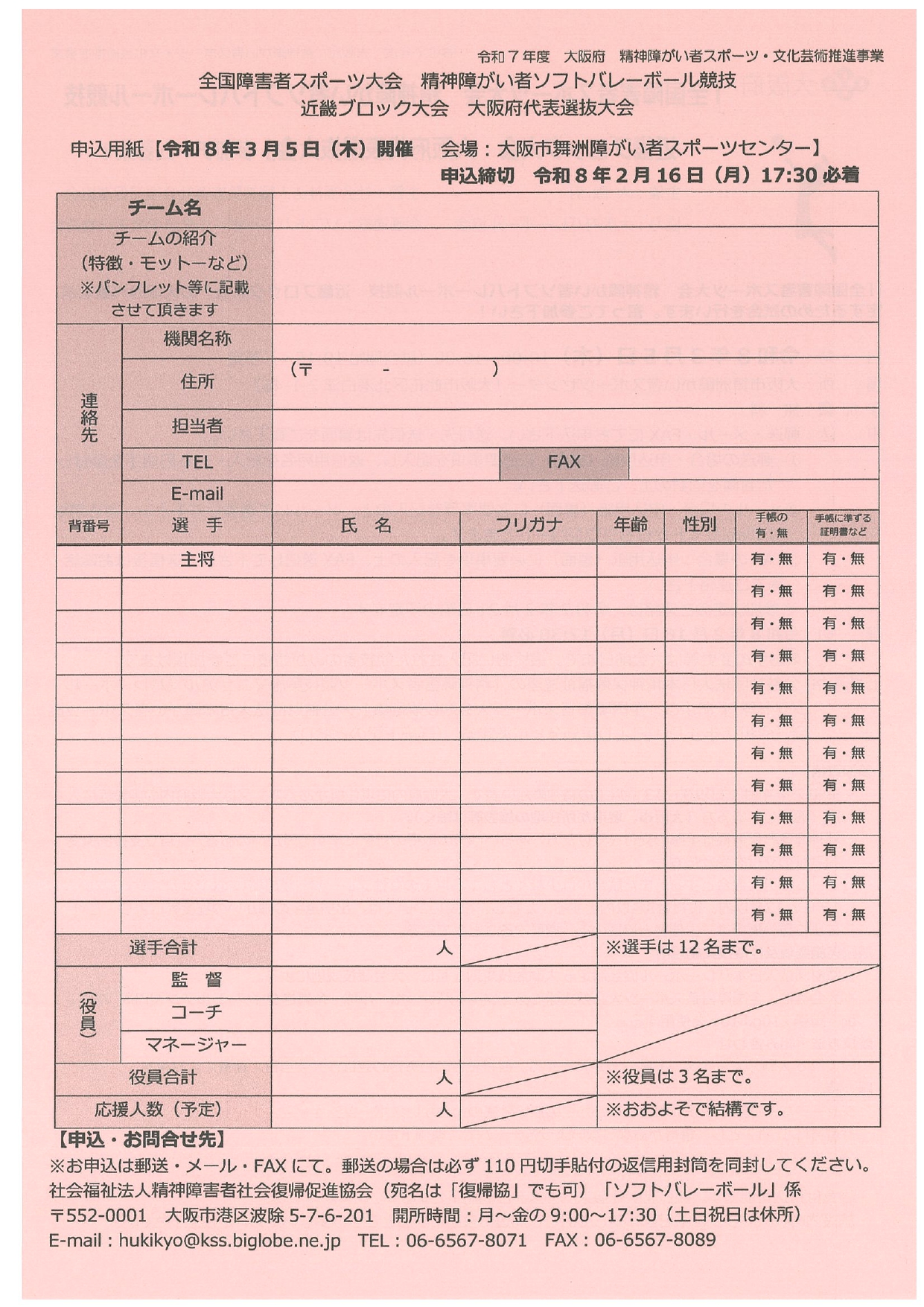 | 参加資格 | ・令和7年4月1日現在、13歳以上の精神障がい者で、大阪府内に現住所がある方。又は大阪府内の施設等に入所/通所している方(大阪市、堺市が所在地の施設等は除く) ・精神障害者保健福祉手帳の交付を受けた方。あるいは取得の対象に準ずる障がいのある方(自立支援医療受給者証の交付を受けた方) ・チームは男女混合をする。また、試合中は少なくとも1名以上の女性プレイヤーが出場していなければならない。 ・1チーム12名以内、役員は3名以内とする。ただし、役員については出場選手の障がいの程度等により、これにより難い場合は、主催者と協議の上、増員することができる。 |